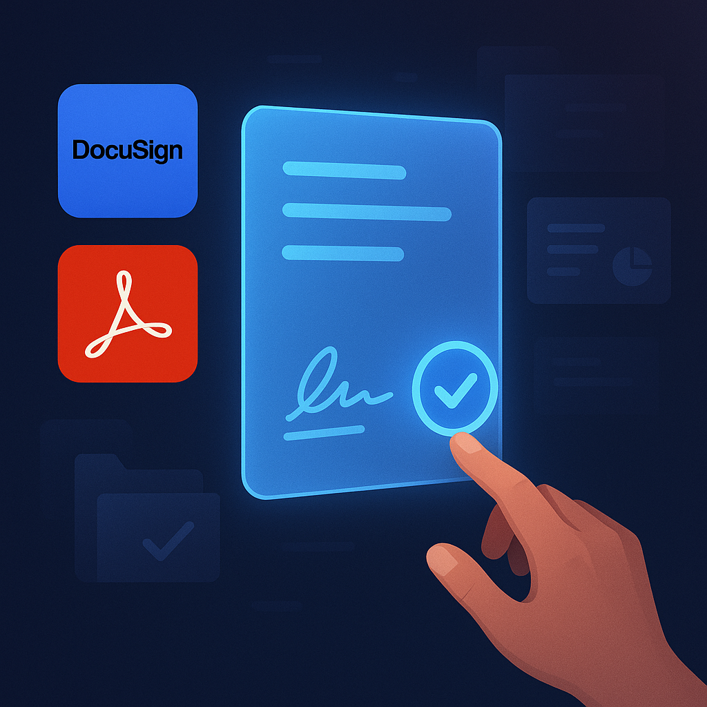 Integrates with providers like DocuSign or Adobe Sign to create envelopes from templates, send signature requests, track signing status, and store completed documents. Supports common flows such as employment contracts, NDAs, and sales agreements.
